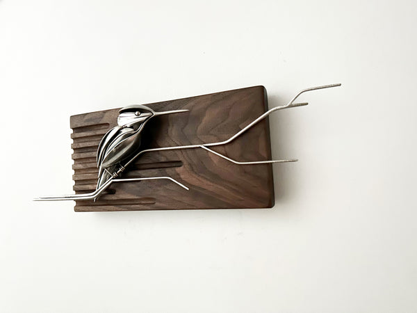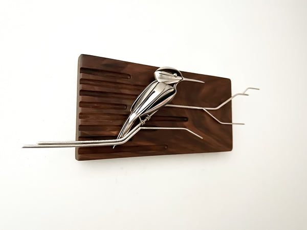 Hummingbird made from upcycled utensils and scrap metal mounted on a custom wooden plaque. Signed and ready to hang.