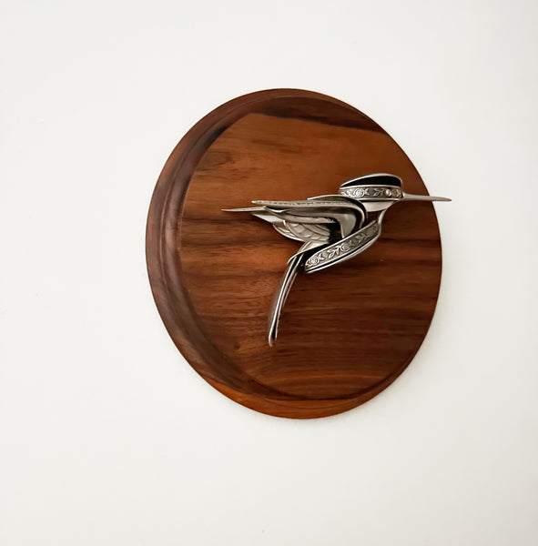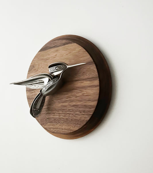 Hummingbird made from upcycled utensils and scrap metal mounted on a custom wooden plaque. Signed and ready to hang.