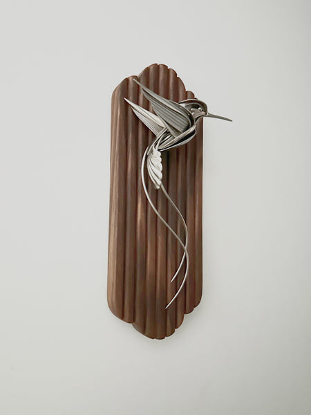 Hummingbird made from upcycled utensils and scrap metal mounted on a custom wooden plaque. Signed and ready to hang.