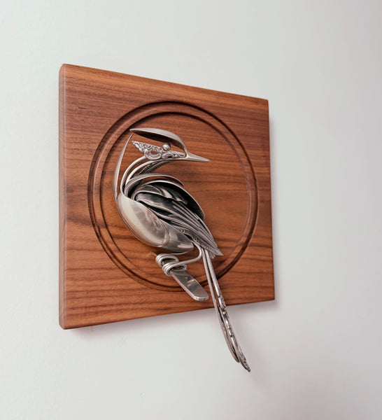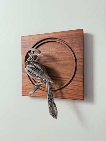 Bird made of upcycled utensils and scrap metal mounted on a custom wooden plaque. Signed and ready to hang.