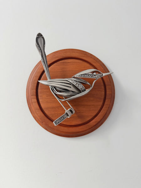 Bird made from upcycled utensils and scrap metal mounted on custom wooden plaque. Signed and ready to hang.