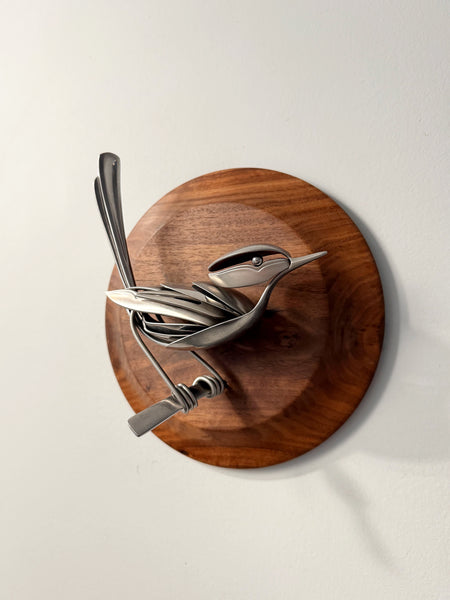 Bird made of upcycled utensils and scrap metal mounted on a custom wooden plaque. Signed and ready to hang.