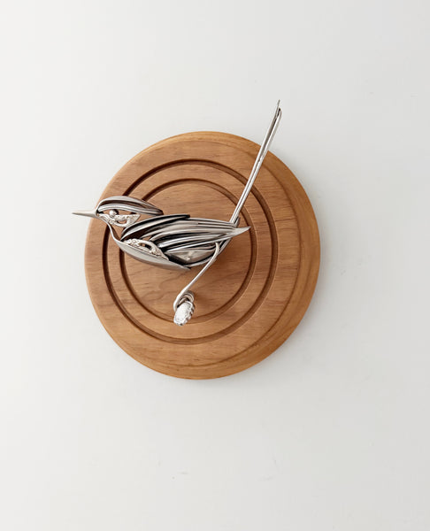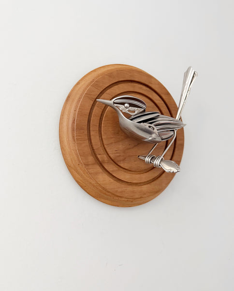 Bird made of upcycled utensils and scrap metal mounted on custom wooden plaque. Signed and ready to hang.