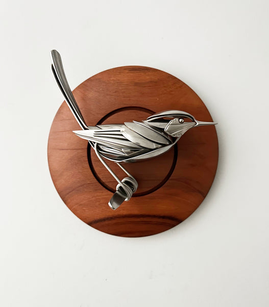 Bird made of upcycled utensils and scrap metal mounted on custom wooden plaque. Signed and ready to hang.