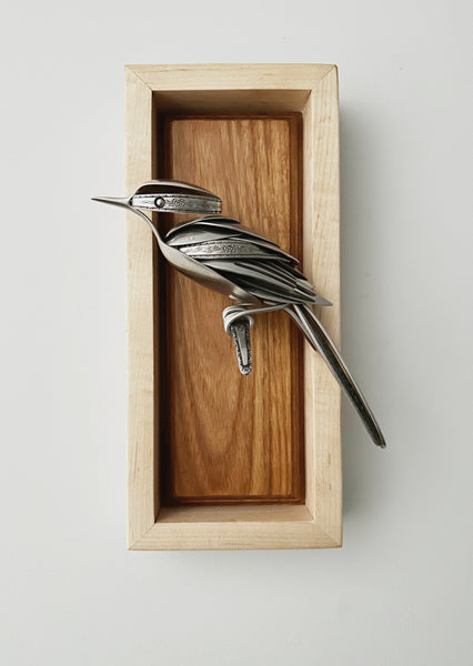 Bird made of upcycled utensils and scrap metal mounted on custom wooden plaque. Signed and ready to hang.