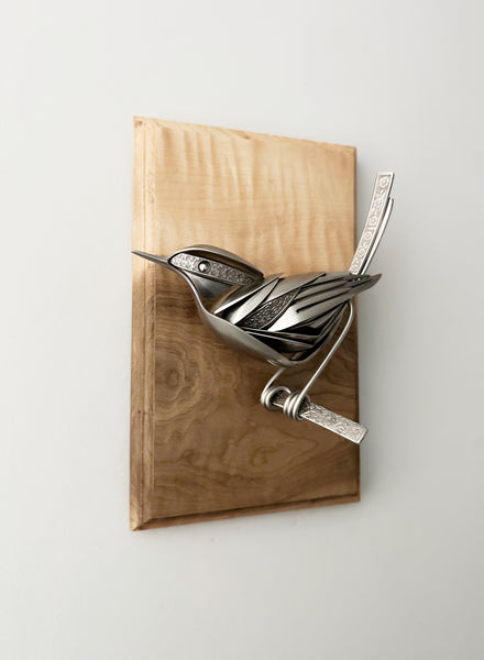 Bird made of upcycled utensils and scrap metal mounted on custom wooden plaque. Signed and ready to hang.