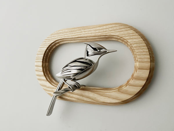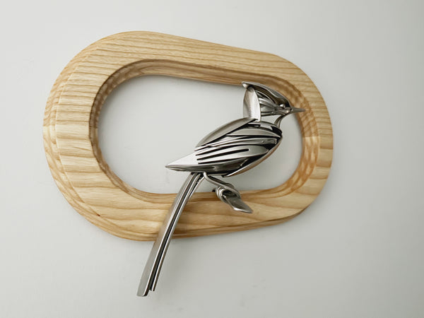 Bird made of upcycled utensils and scrap metal mounted on custom wooden plaque. Signed and ready to hang.