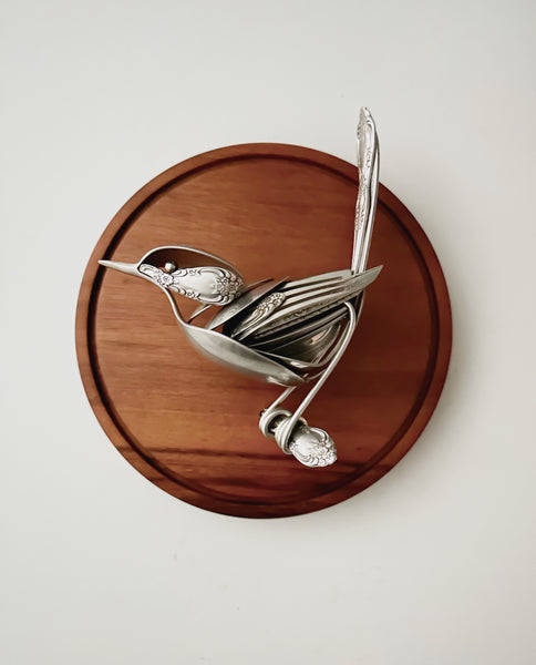 Bird made of upcycled utensils and scrap metal mounted on custom wooden plaque. Signed and ready to hang.