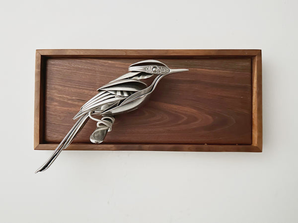 Bird made of upcycled utensils and scrap metal mounted on custom wooden plaque. Signed and ready to hang.