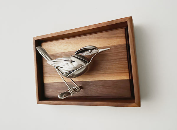 Bird made of upcycled utensils and scrap metal mounted on custom wooden plaque. Signed and ready to hang.