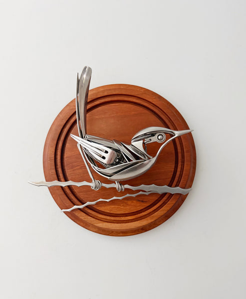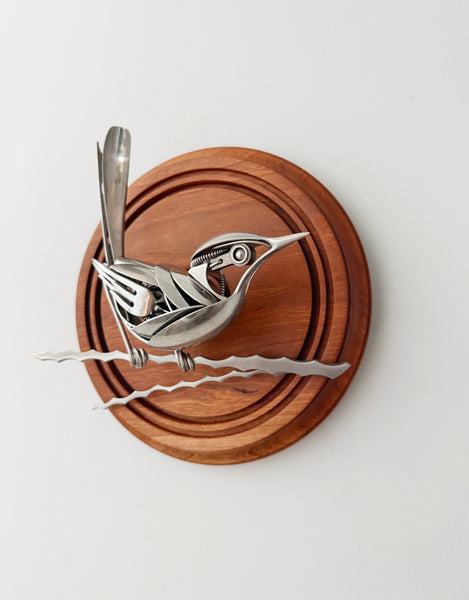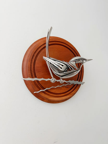 Bird made from upcycled utensils and scrap metal mounted on custom wooden plaque.