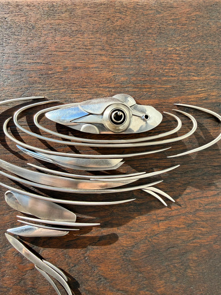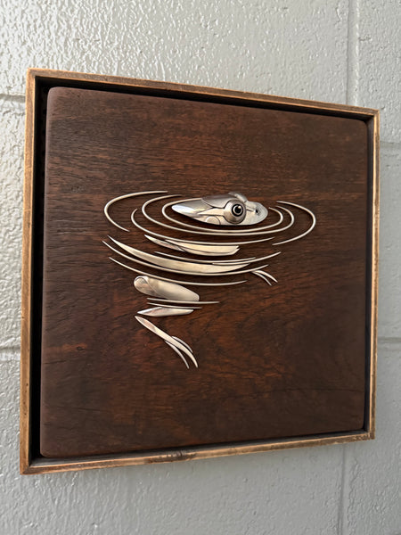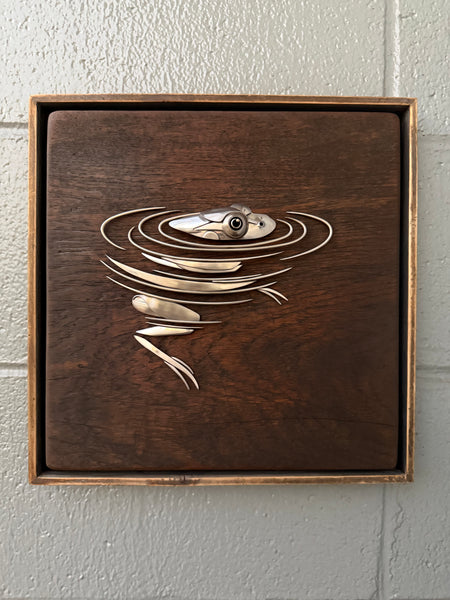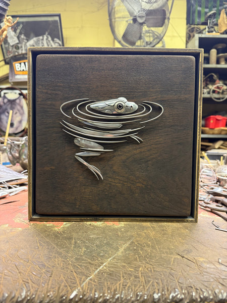 Frog in water made out of upcycled utensils and scrap metal mounted on custom wooden plaque. Signed and ready to hang.