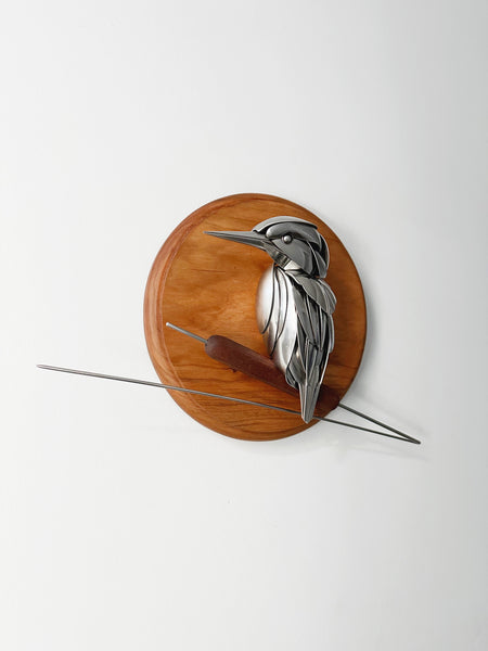 Kingfisher perched on cattail made of upcycled utensils and scrap metal mounted on custom wooden plaque. Signed and ready to hang.