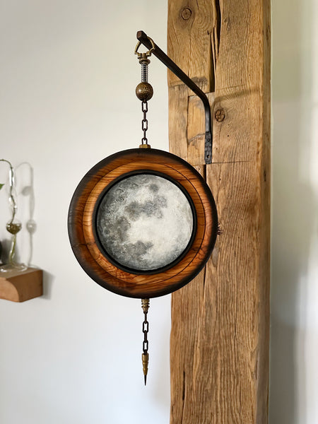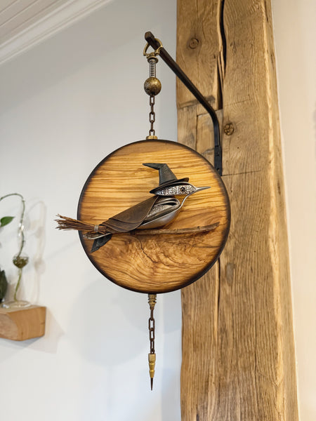 Double sided moon and witchy bird made from upcycled utensils and scrap metal mounted on a custom wooden plaque. Features a hand painted full moon and comes with a custom hanger. Not recommended for display outside.