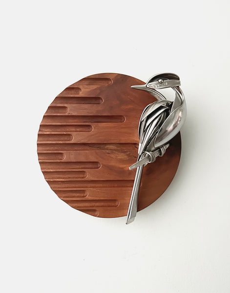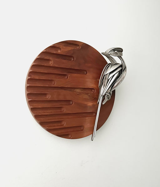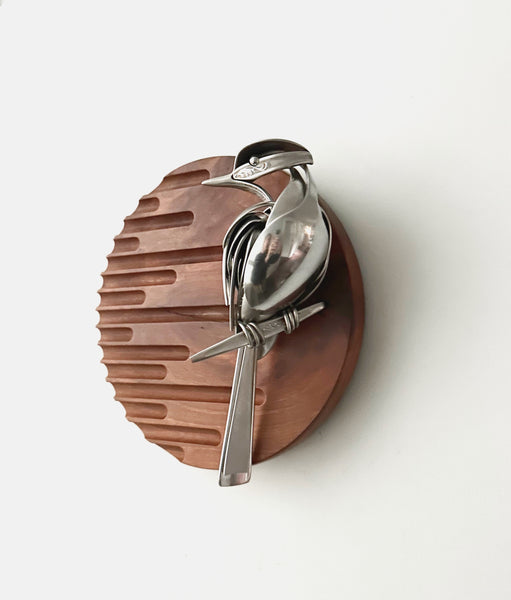 Bird made of upcycled utensils and scrap metal mounted on custom wooden plaque. Signed and ready to hang.